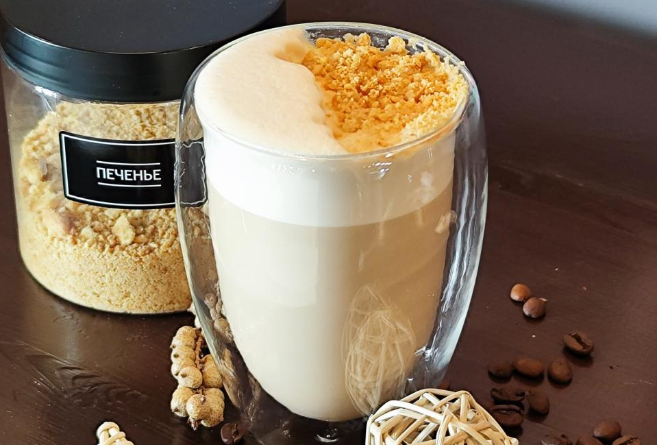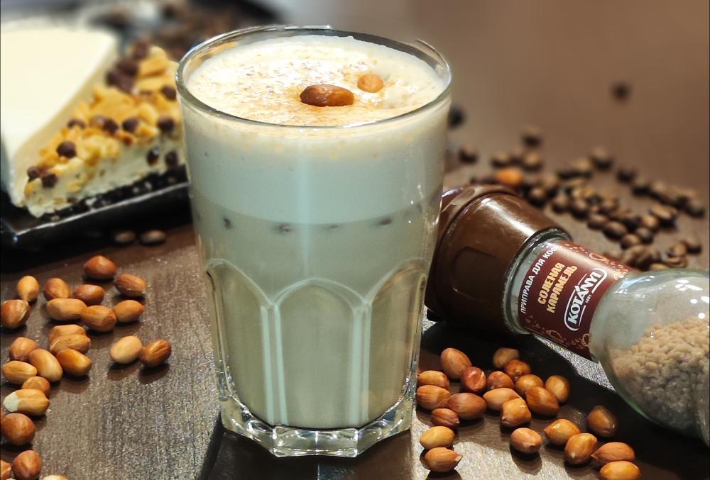 Молоко ультрапастеризованное, сливки ультрапастеризованные, эспрессо, паста арахисовая натуральная, сироп «Соленая карамель»