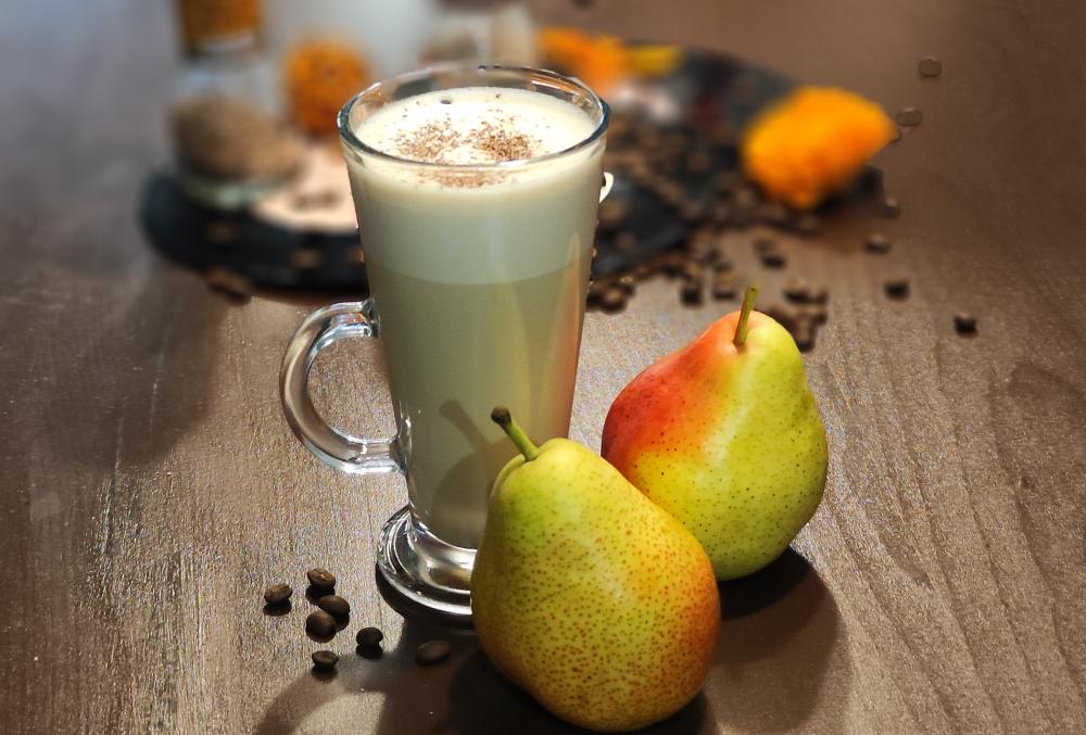 Эспрессо, молоко ультрапастеризованное, сливки ультрапастеризованные, пюре грушевое, сахарная корица для украшения
