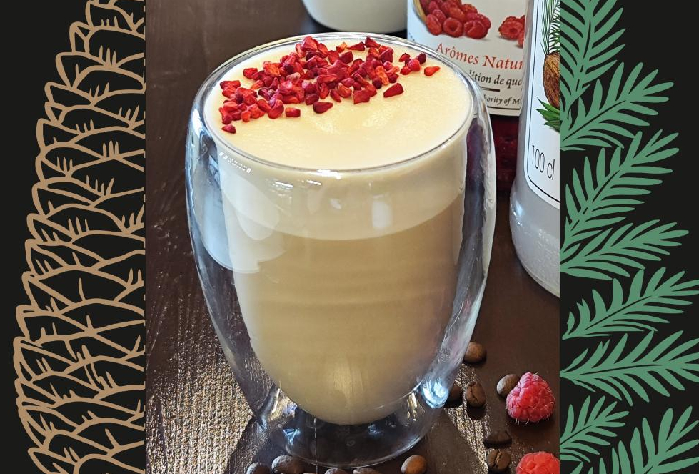 Молоко ультрапастеризованное, сливки ультрапастеризованные, эспрессо, сироп «Малина», малина сублимированная для украшения