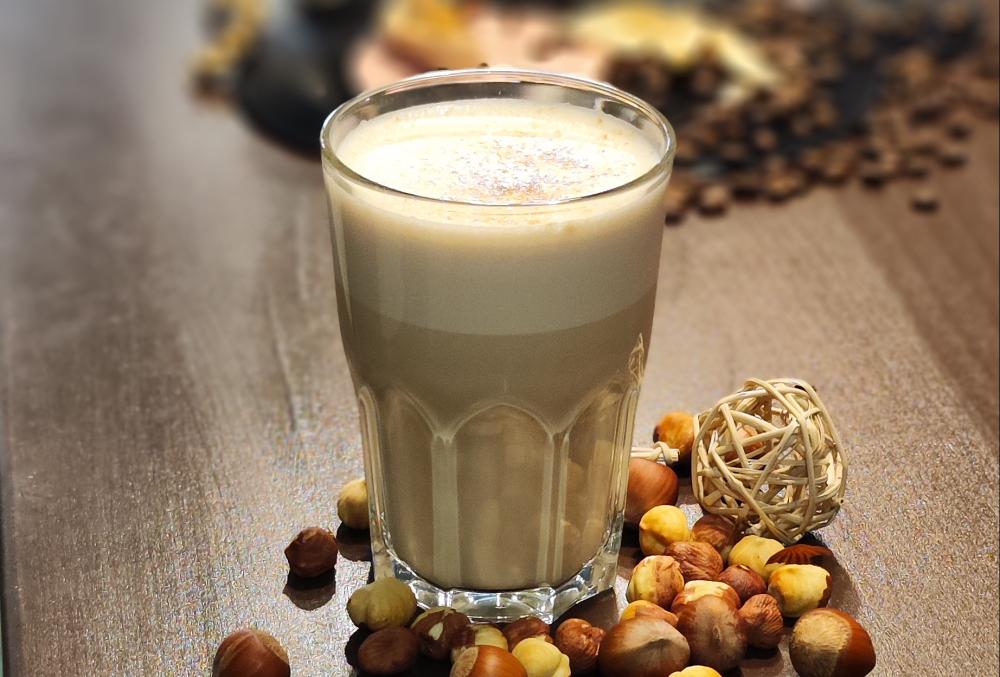 Эспрессо, молоко ультрапастеризованное, сливки ультрапастеризованные, натуральная фундучная паста, сироп "Лесной орех".